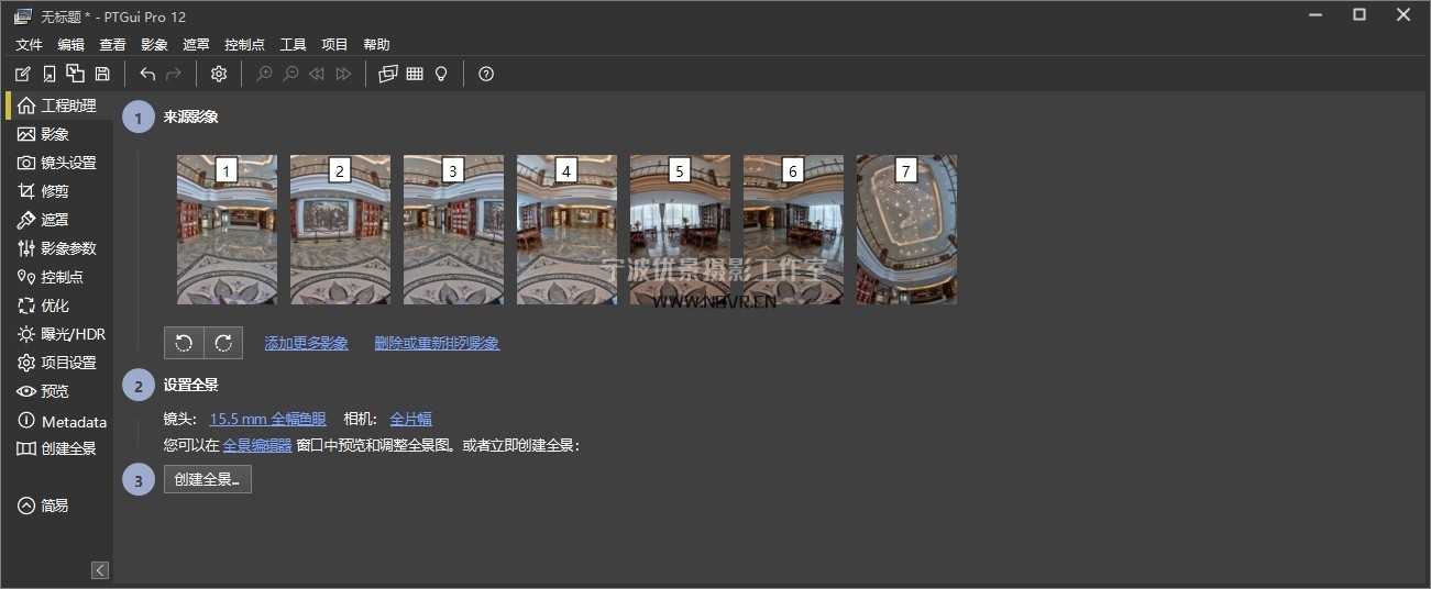 如上图:本次使用6+1+1模式拍摄,360度分6等份拍摄6张,顶部1张和地面1张。